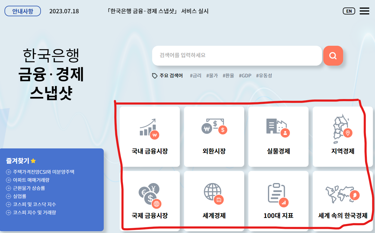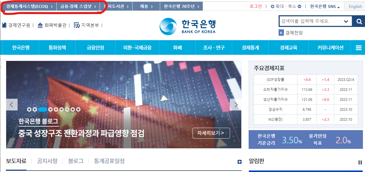 한국은행 공식 홈페이지에 들어가서 왼쪽 상단에 보면 경제통계시스템(ECOS)와 금융경제 스냅샷을 확인할 수 있음