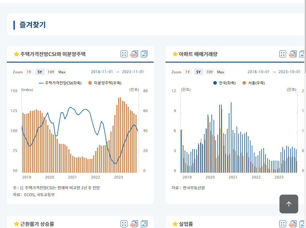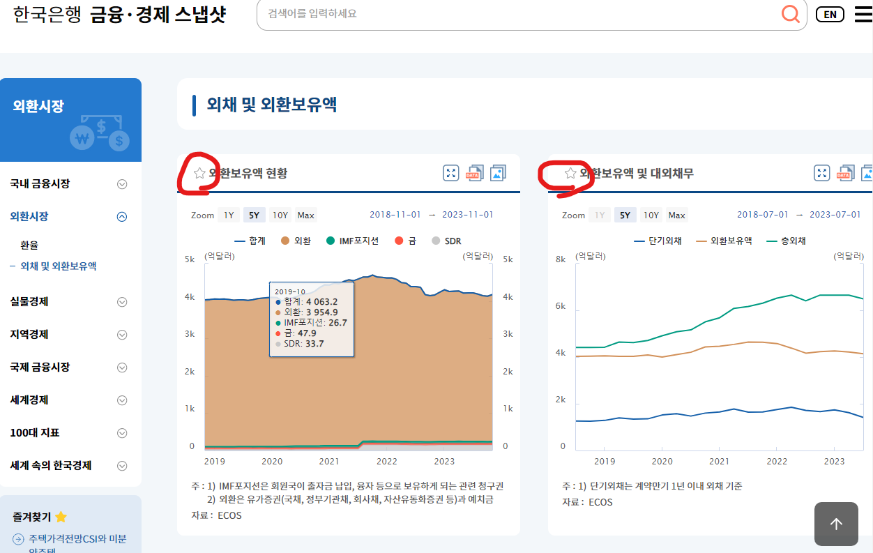 ECOS 시스템이 특정 항목에 대해 상세하게 보는 것이라면 금융경제 스냅샷은 필요한 부분만 간단하게 보는 것임. 그래서 내가 정기적으로 확인할 필요가 있는 항목은 즐겨찾기로 해놓으면 쉽게 확인할 수 있음
