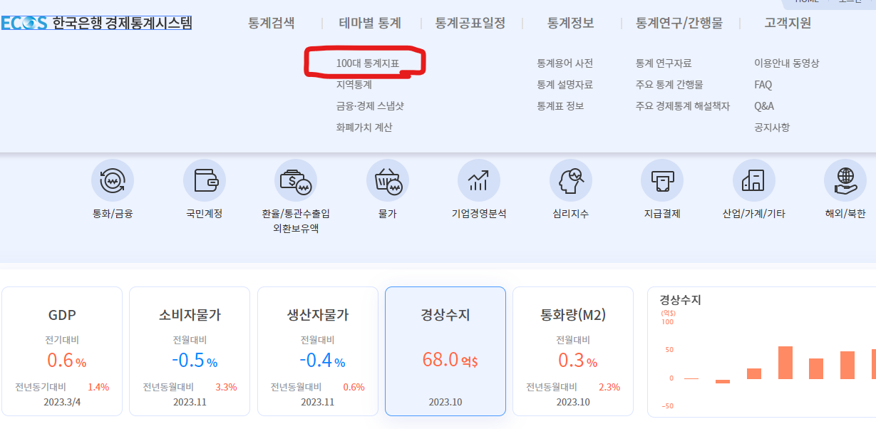 ECOS 시스템에서 테마별 통계 - 100대 통계지표를 들어가보면 중요한 100대 통계지표들을 상세하게 정리해둠