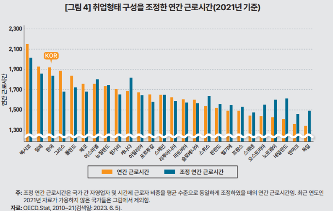 한국의 연간 근로시간은 코로나19 충격이 한정적이었고, 장기적으로는 빠르게 감소해 왔다. 이와 관련된 주요 요인으로는 경제성장에 동반된 생산성 향상 및 장시간 근로 관행의 개선을 위한 제도적 노력이 있다. 하지만 이런 감소 추세에도, 한국의 연간 근로시간은 여전히 여타 국가에 비하여 상당히 긴 수준이다. 2022년 기준 전체 취업자의 1인당 연간 근로시간은 한 국(1,901시간)이 OECD 전체 38개 회원국 중 5위이며, OECD 평균(1,752시간)보 다 149시간 더 길다.