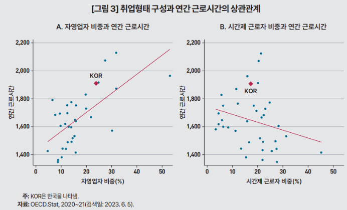 한국은 다른 국가에 비해 자영업자 비중이 크고 시간제 근로자 비중이 작은 탓에 1인당 연간 근로시간이 비교적 길게 나타나는 측면이 있다. 이러한 취업형태 구성의 차이를 통제하면, 한국과 여타 OECD 국가의 연간 근로시간 격차가 약 31% 감소한다. 다만, 자영업자 및 시간제 근로자 비중의 영향을 고려하더라도, 한국은 비교적 장시간 근로 국가이다.