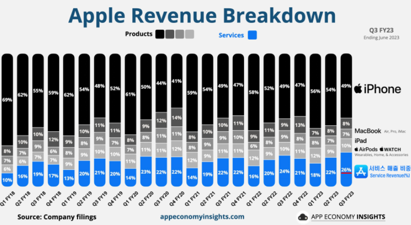 위의 이유를 보았을 때 저는 장기적으로 감소할 아이폰 매출을 대체할 수단으로 비전 시리즈를 개발하고 있다고 생각합니다. 하지만 여기서 중요한 것은 비전 시리즈를 통한 직접적 매출이 아니라, 비전 시리즈를 통한 서비스 이용 고객을 높이고, 이를 통한 매출 향상을 노린다는 것입니다. 아마 애플은 현재 50%를 보이고 있는 아이폰 매출 비중을 서비스 매출 비중으로 바꾸길 원할 것입니다. 서비스 매출은 구독제로 보통 한 번 구독하면 구독을 취소하기가 쉽지 않다는 특징이 있죠. 특히 애플의 생태계는 폐쇄적이라 더 그렇습니다. 서비스 매출을 확보한다면 확실한 캐시카우가 확보되는 것이죠. 또한 공급망의 영향을 받지 않을 것입니다. 중국에서 주로 아이폰이 생산됐었는데 중국의 이슈에 따른 아이폰 생산 문제도 있었죠. 하지만 서비스 제품은 이런 공급망 문제를 피할 수 있습니다.
